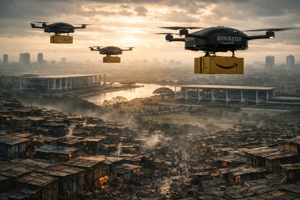 Três drones da Amazon Logistics sobrevoam a ocupação às seis da manhã. Entrega de pacotes para os níveis superiores, aqueles que ainda têm crédito suficiente no sistema para receber objetos físicos em vez de apenas licenças digitais de uso temporário. O barulho acorda todo mundo, como sempre, as crianças correm para a laje esperando que alguma caixa caia, que algum drone tenha falha de navegação e largue carga no lugar errado.