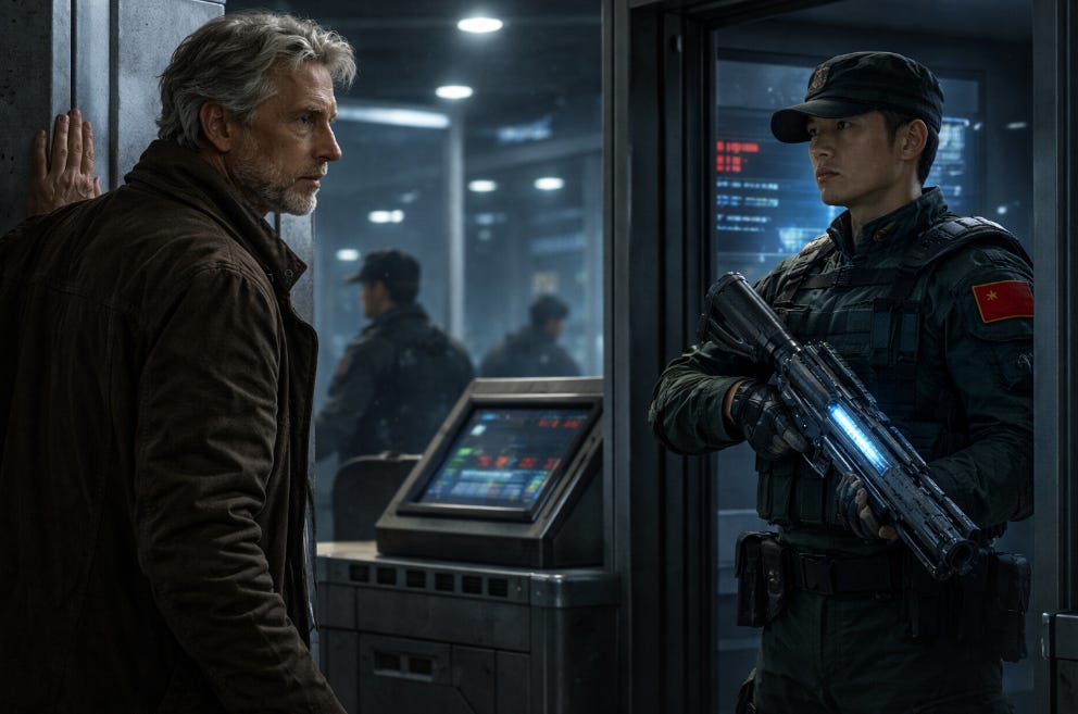 A linha de controle fica a quarenta minutos de caminhada da ocupação. Atravesso todos os dias para chegar ao Museu, todos os dias passo pelo checkpoint norte operado pela Forever Defense Corporation. O scanner me identifica assim que entro na zona de detecção, leitura facial automática cruzada com dados biométricos do chip subcutâneo que todos carregamos desde o Acordo de Reorganização Populacional de 2087. O guarda hoje é jovem, uniforme impecável, rifle de plasma discreto na lateral da cabine blindada. Ele nem olha para mim enquanto a tela à sua frente processa minha identidade, histórico de deslocamento, índice de conformidade social.