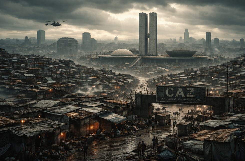 A humilhação ainda queima na pele. O guarda não sabe que o prédio para onde vou costumava ser um ministério de um país que existiu, que esta avenida já foi eixo de poder soberano, que Brasília significava algo além de zona administrativa dividida entre corporações. Para ele eu sou apenas mais um residente de ocupação cruzando para trabalho aprovado, corpo a ser processado pelo sistema de controle, suspeita permanente registrada no chip que carrego sob a pele do punho esquerdo desde que nasci.