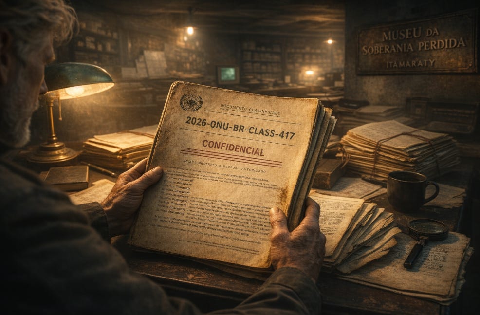 Abro o arquivo físico 2026-ONU-BR-CLASS-417 quando chego na sala de pesquisa. O cheiro de papel velho invade o espaço. Cento e vinte e três anos entre o dia em que estes documentos foram impressos e o momento em que meus dedos tocam a borda amarelada da primeira página. O tempo como abismo, como vertigem.