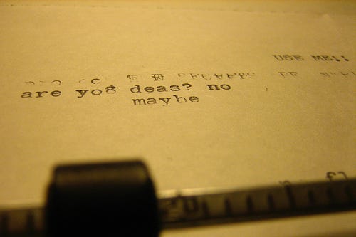 Às vezes, me percebo de outro lugar, observando a mim mesmo datilografando em uma máquina de escrever antiga, sentindo a temperatura da sala, o peso do meu corpo sobre a cadeira giratória, a tensão nos dedos a cada toque nas teclas, o movimento dos braços metálicos imprimindo letras no papel branco. Tudo isso vai formando esta ideia que tento compartilhar. E ao fazer isso, dissolvo a ilusão de que eu escrevendo aqui e você lendo aí somos entidades separadas.